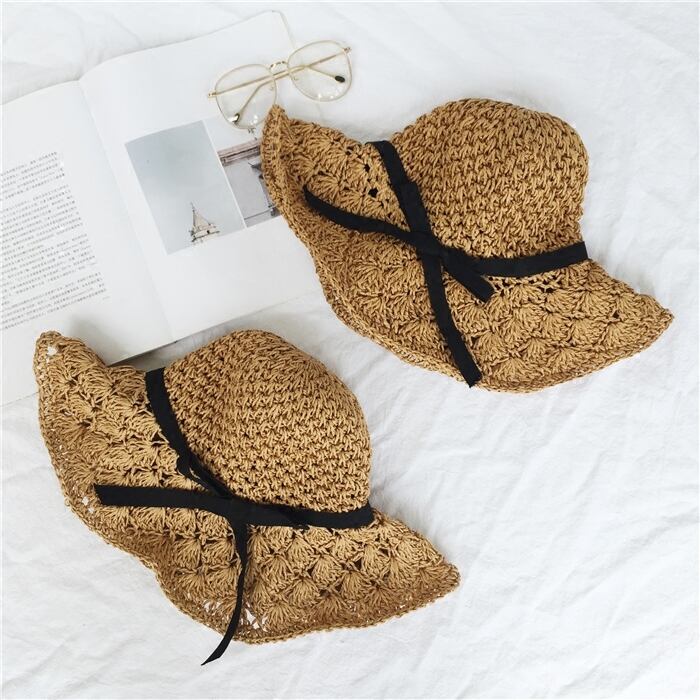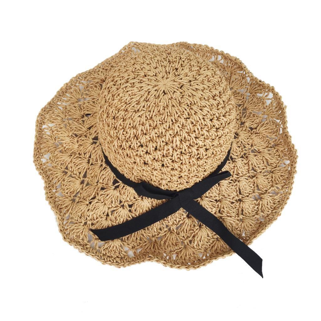 手作り麦わら帽子ボウノットビーチサンハット女性折りたたみ式洗面器ハット海辺の休暇poサンハット ブラック・アイド・ピーズ75692426545