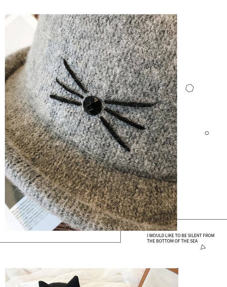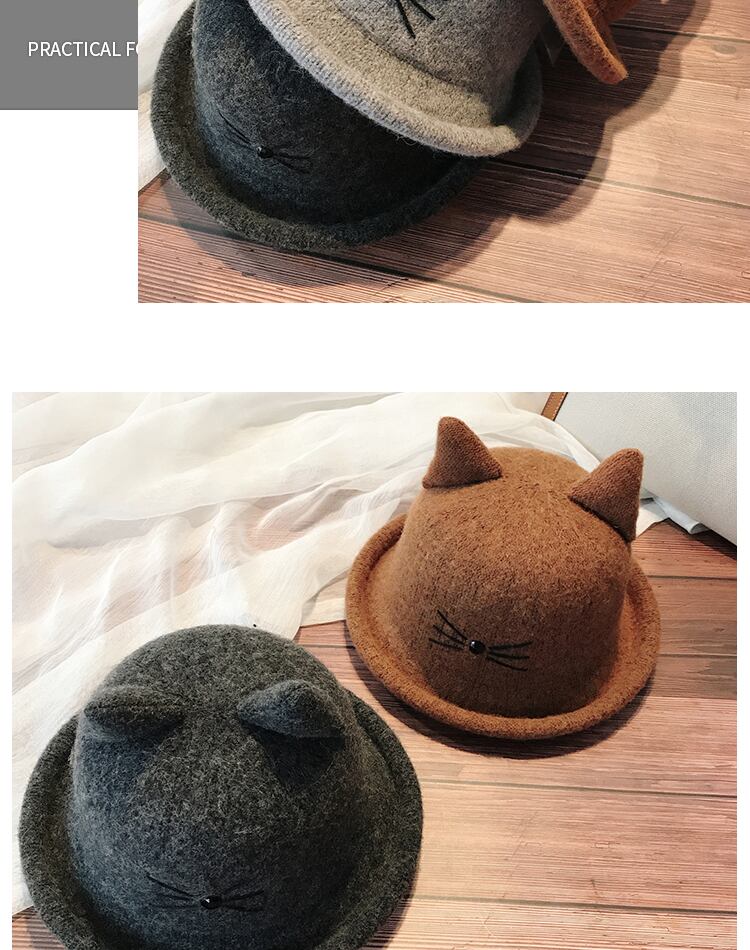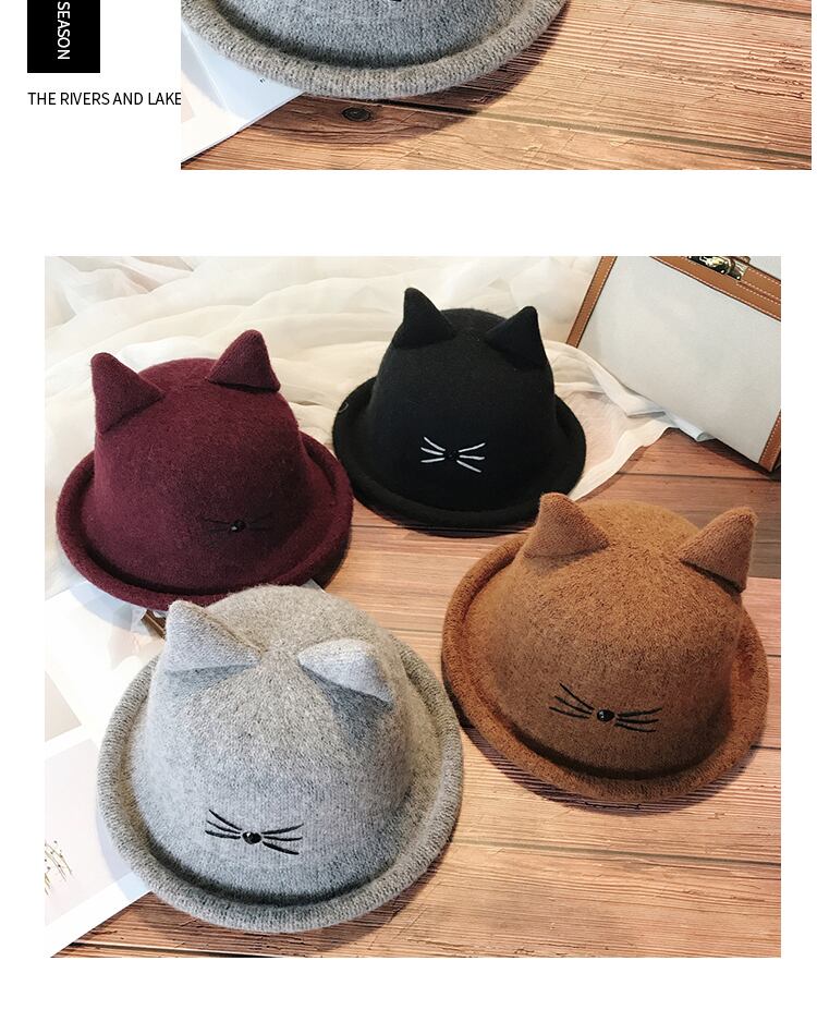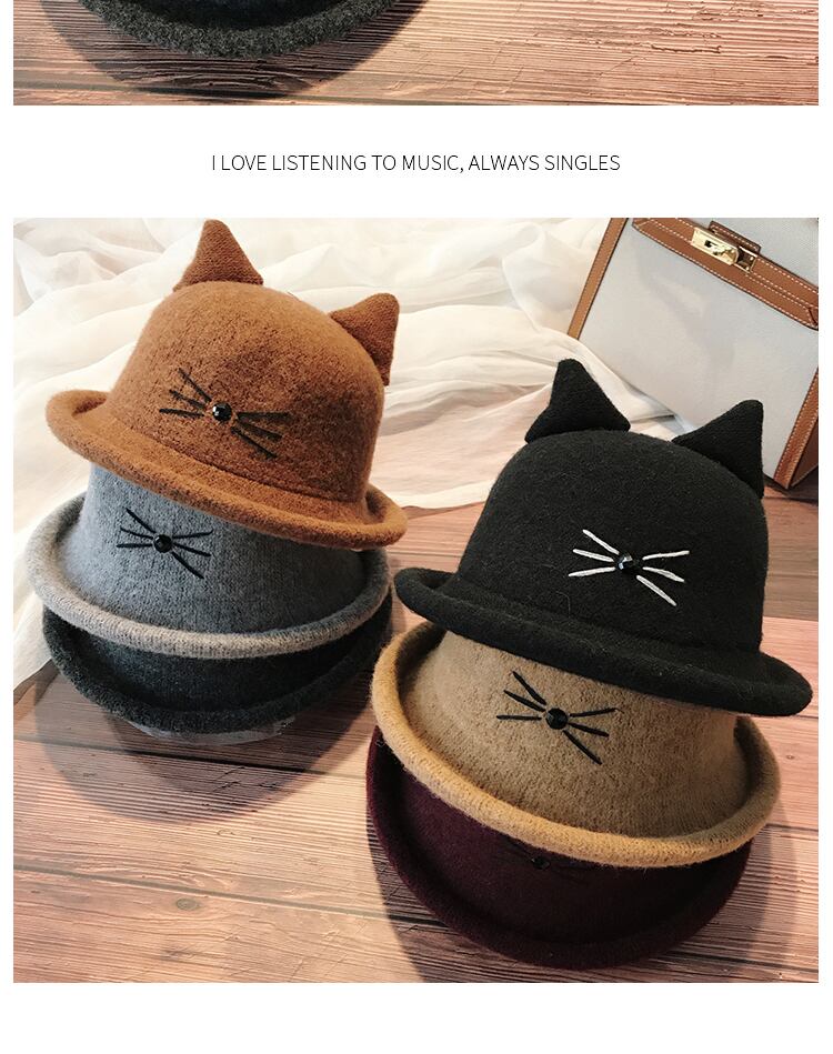 ese秋と冬ウールカールかわいい猫ポット帽子レディースシルクハット野生の猫の耳アートフィッシャーマンハット ブラック・アイド・ピーズ96778508353