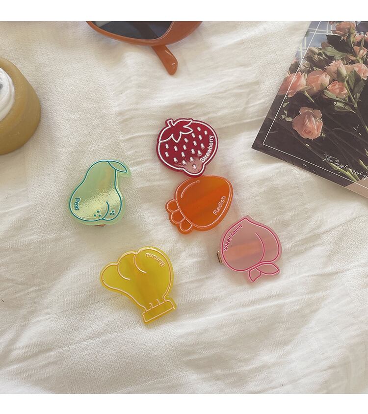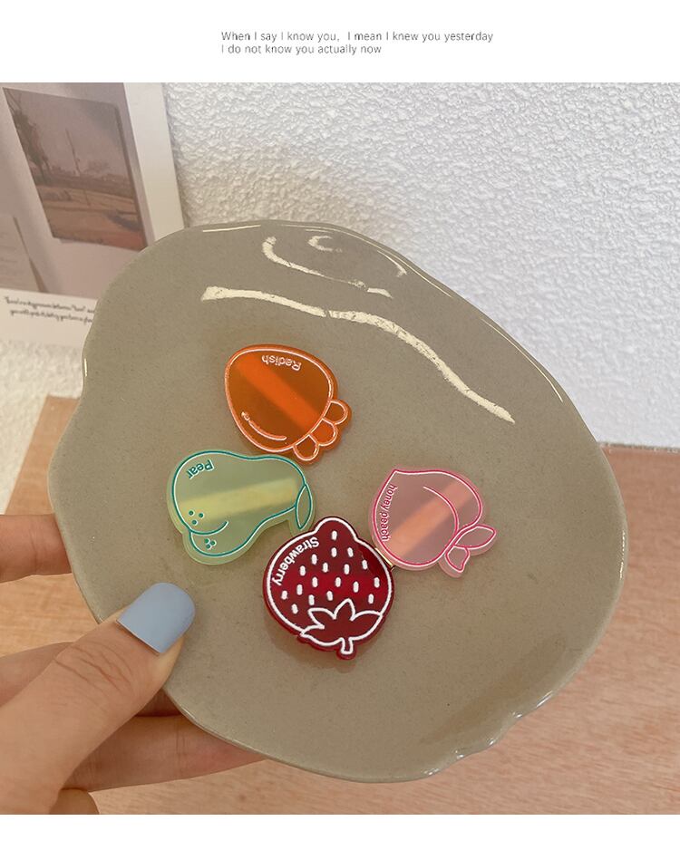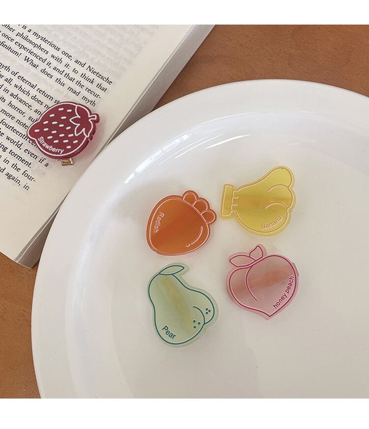 色:ピンク桃,赤いいちご,黄色のバナナ,チュウゴクナシ,にんじん